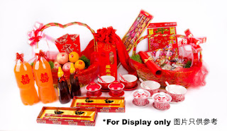 After the Betrothal gift (Guo Da Li), on the same day the bride has to return some gift to the bridegroom, thing to be include in the return basket are: some biscuit(xi bing), 18 wedding pastries (Huat kueh) , 2 bottles of orange juice, some melon and lotus seeds , candied dates, longan , tea, 8 oranges and 8 apples. Besides that, the mother in law has to buy pants, belts and purses to the son in law as a symbol of good luck and prosperities.